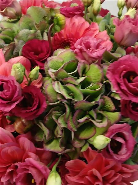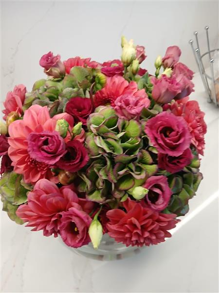 Rounded arrangement featuring vibrant pink dahlias, lisianthus and hydrangea, tightly styled for colour depth and texture, ideal as a low centrepiece or stylish gift.