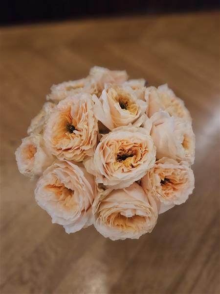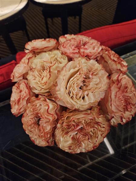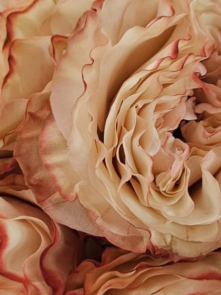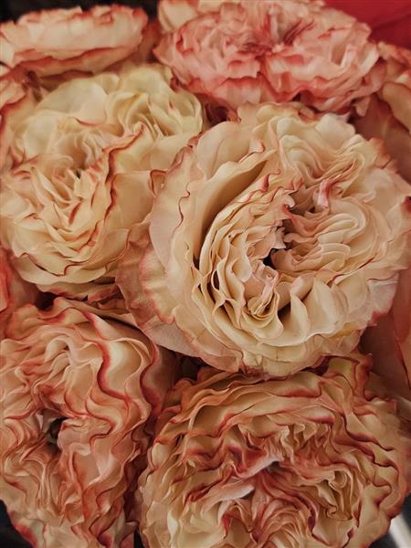 A compact hand-tied bouquet of frilled roses in warm cream tones with defined rose-red edges, arranged using fresh stems for a rich, textured focal design.
