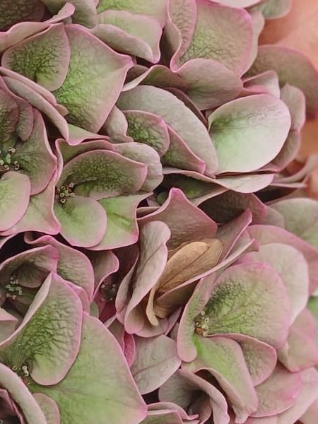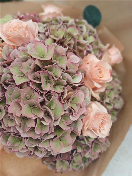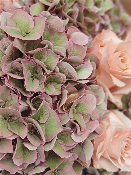 A rounded hand-tied of antique green and soft mauve hydrangea with blush roses, arranged closely for a calm, muted palette and full, layered texture.