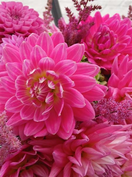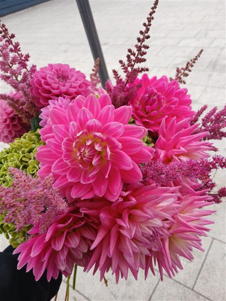 Bold hand-tied bouquet of vivid pink dahlias, lime hydrangea and feathery astilbe, tightly arranged for strong colour contrast and texture in a clean, modern style.